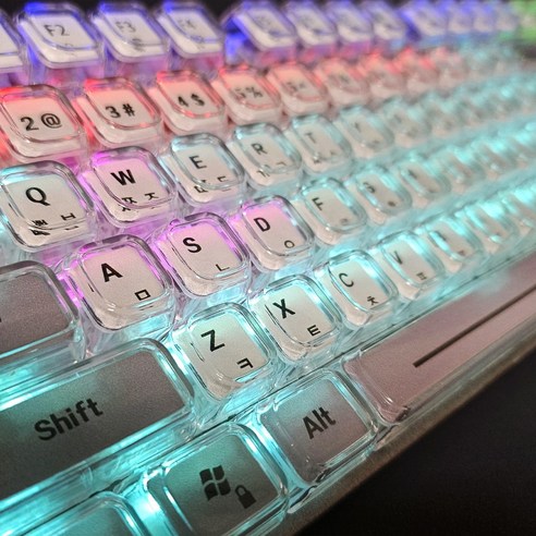 RGB 조명을 사용할 때는 투명하거나 푸딩 키캡이 가장 효과적입니다. 템빨 투명 크리스탈 키캡이나 사오파오 푸딩 키캡은 RGB 조명의 빛을 잘 퍼뜨려 화려한 효과를 제공합니다.