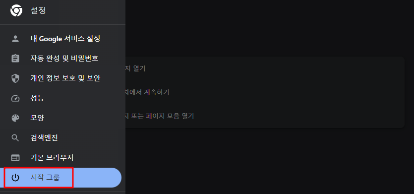 2. 설정 페이지의 왼쪽 메뉴에서 "시작 그룹"를 선택합니다.