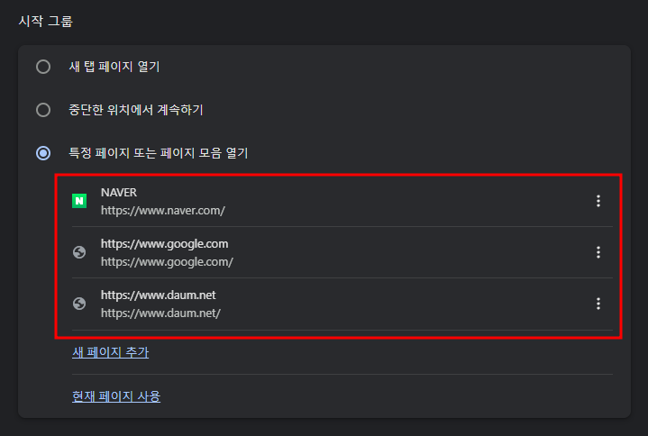 한 개의 시작 페이지를 설정하는 것 뿐만 아니라 여러 개의 웹 페이지를 동시에 시작 페이지로 설정할 수도 있습니다. 앞서 소개한 방법으로 시작 페이지 설정 화면에서 원하는 만큼 새 페이지를 계속 추가하면 됩니다.