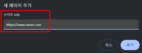 4. "새 페이지 추가"를 누른 후, 원하는 웹 페이지의 주소(URL)을 입력합니다.