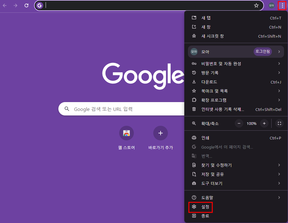 1. 크롬 브라우저의 오른쪽 상단에 있는 더보기 버튼(점 세 개)을 클릭한 후 설정으로 들어갑니다.