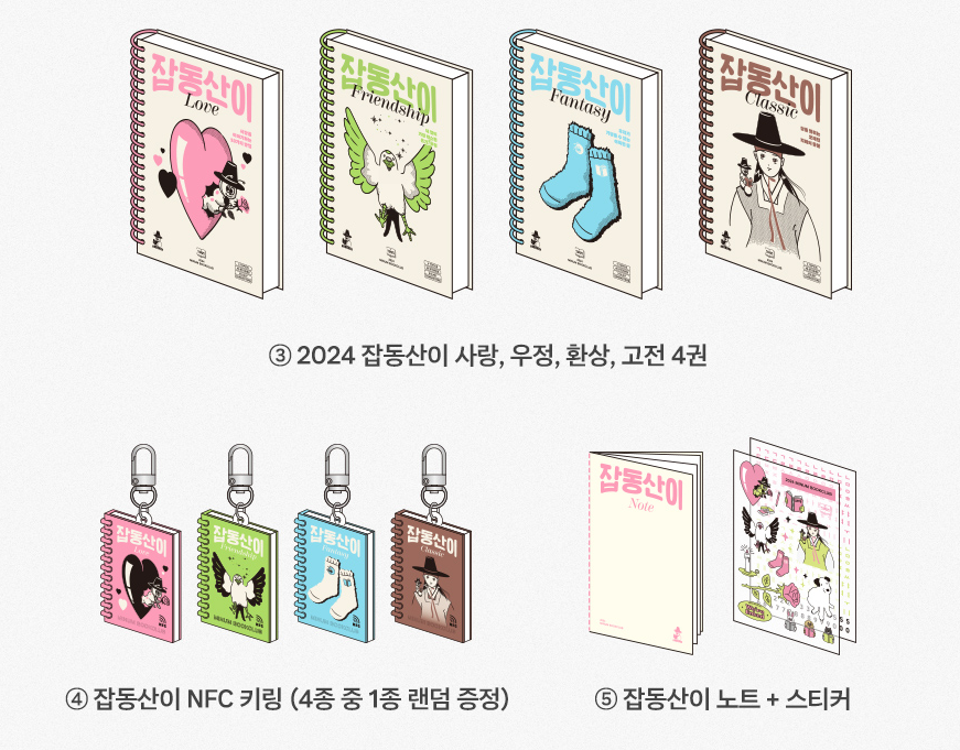 어떤 혜택이 있길래 이렇게 인기가 있을까요? 첫째, 제공되는 도서와 혜택이 매우 알차다는 점이었습니다. 연간 50,000원의 가입비에도 불구하고, 기본적으로 제공되는 도서만 해도 6권에 달했으며, 그 외에도 잡동산이 NFC 키링, 노트, 스티커 등 다양한 가입 선물이 준비되어 있습니다.