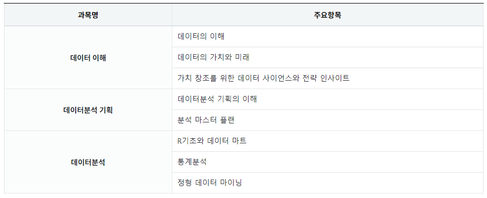 ADsP 데이터분석준전문가 시험은 '데이터의 이해', '데이터 분석 기획', 그리고 '데이터 분석'의 세 과목으로 이루어져 있습니다.